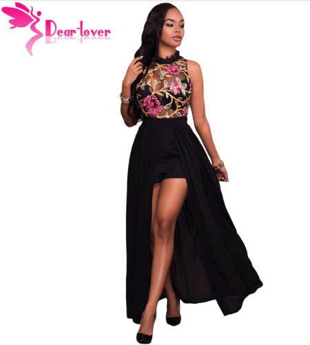 Dear-Lover Long jumpsuits Summer Short Overalls Black Sheer Mesh Embroidery Sleeveless Chiffon Club Party Womens Rompers LC64265